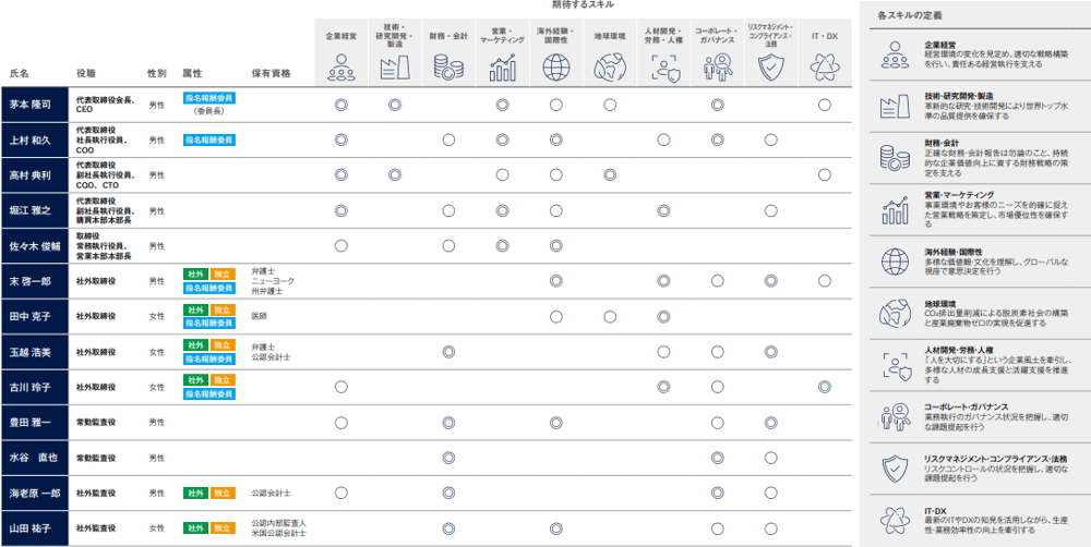 The abilities and experience of Members of the Board and Audit & Supervisory Board Members of the Company in relation to the skills required for the Company to achieve its 2026 Medium-term Management Plan and to contribute to a sustainable society by supplying “indispensable key parts” are as follows: