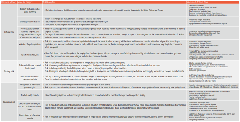 NHK Spring seeks to prevent risks that could affect sound corporate management before they occur, and to minimize losses in the event that such risks materialize.